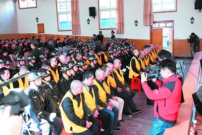 8時(shí)30分,庭審正式開始。宣布完法庭紀(jì)律后,審判長一聲令下:“傳被告人到庭!”緊接著,27名身著橘色背心的被告人被帶上法庭。被告人在魚貫而入時(shí),均不時(shí)向旁聽席上張望,而旁聽席上也傳來一陣細(xì)細(xì)的抽泣聲。