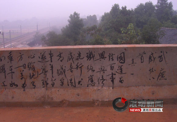 “太有才了!如此流暢的書法作品,的確為鐵路建設增色不少!本W(wǎng)友“龍?zhí)t”在紅網(wǎng)論壇發(fā)《水泥墻上見功底武廣橋上一奇葩》,帖中曝料他在武廣高速鐵路客運專線上的一跨線橋的擋墻上,拍到建橋人如行云流水一般的書法作品。據(jù)當?shù)刂槿苏f,這些書法作品是其中一位承建包工頭建完橋后有感而書的。