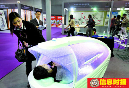 “這是家庭用的水療美體太空艙,過去只在國外流行,現(xiàn)在是在中國很流行!眮碜员本┠翅t(yī)療器械公司負(fù)責(zé)人沈麗娟說,中國人很講求私密性,到美容院做美體水療不如在家來得舒坦。這臺家用式水療美體太空艙集沐浴、水療、按摩、干溫蒸等功能于一體,內(nèi)部還設(shè)紅外線治療、LED藍(lán)光治療等,而且可以一邊做美體一邊聽音樂、睇電視。
