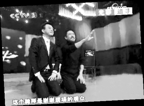 周潤發(fā)(突然拉著朱軍,面對現(xiàn)場觀眾跪了下來):讓你感受一下《孔子》是如何復(fù)原兩千年前的真實(shí)生活的。(接著以額貼地,實(shí)實(shí)在在地給觀眾叩了一個(gè)頭)這個(gè)跪拜是謝謝現(xiàn)場的觀眾。