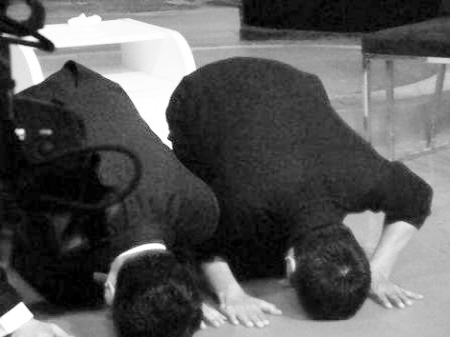 據(jù)網(wǎng)友爆料,節(jié)目錄制一開始朱軍先采訪了導(dǎo)演胡玫和主演周迅等主創(chuàng),大家也都相當(dāng)配合《藝術(shù)人生》一貫的煽情風(fēng)格。最后發(fā)哥出場,現(xiàn)場氣氛立即來了個(gè) 180度大逆轉(zhuǎn)。周潤發(fā)先是慢條斯理地說了一句“《孔子》應(yīng)該搞一點(diǎn)氣氛”之后,讓工作人員把燈關(guān)掉。隨后,發(fā)哥突然拉著朱軍,面對現(xiàn)場觀眾跪了下來,說這是為了讓他感受《孔子》是如何復(fù)原兩千年前的真實(shí)生活,之后以額貼地,給觀眾叩頭,說要感謝觀眾。緊接著,發(fā)哥又給朱軍叩頭,學(xué)著朱軍慣用的深情語調(diào),朱軍跟他父親的故事令他非常感動。這下,朱軍不得不以磕頭“還禮”。而在12月2日播出的節(jié)目中,只保留了周潤發(fā)給朱軍磕頭的一幕,朱軍后來的“還禮”卻被剪掉了。