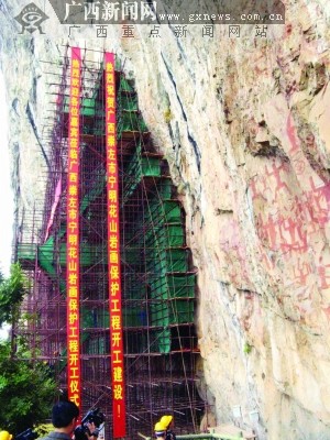 昨日上午,在簡(jiǎn)短而隆重的開工儀式后,廣西崇左市寧明花山巖畫保護(hù)工程正式開工。花山巖畫保護(hù)前期工作長(zhǎng)達(dá)18年,僅在方案研究、材料試驗(yàn)和方案設(shè)計(jì)等工作上就耗時(shí)5年,其所動(dòng)用的學(xué)科領(lǐng)域和專家之廣、所耗資金之多,不僅在廣西文物保護(hù)史上史無(wú)前例,就是在中國(guó)文物保護(hù)史上也極為罕見,而此次開工的第一期搶救性加固工程被專家稱為“要干救命的活”。那么等著“救命”的花山巖畫其病害危重到什么程度?為什么前期工作要花費(fèi)那么長(zhǎng)時(shí)間?一期保護(hù)工程將使用哪些先進(jìn)技術(shù)?我們以后還能不能看到它的原貌?記者在保護(hù)工程現(xiàn)場(chǎng)進(jìn)行了采訪。