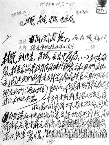 武漢是1949年5月解放的,但從此次披露的電報(bào)手稿影印件來(lái)看,早在2月12日,毛澤東即為中央軍委起草了給四野司令員林彪、政委羅榮桓等人的電報(bào),命令四野先出兩個(gè)軍迫近漢口鉗制白崇禧部,使其不能向東增援以妨礙中野、華野渡江。3月17日又電令四野主力應(yīng)于4月1日前完成出發(fā)準(zhǔn)備。