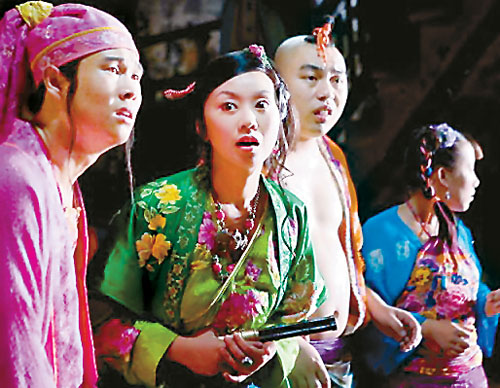 其一,全片表現(xiàn)以“鬧劇”式的敘事假定性(擬古而又將年代模糊化,中英語錯雜使用),劇中角色一個個俱成了從屬于“無厘頭化”情節(jié)進程的符碼,遺去原版人物之“神”而僅存其形、其皮,全都平庸而了無新意。諸如張三、李四、王麻子再饒上兩個添油加醋的小小伙計趙六與陳七(毛毛扮演)。花上200萬美金買來的這個版權(quán),如此做法,不但堪稱極盡奢侈的浪費,同時也標示了主創(chuàng)者創(chuàng)意能力的喪失而淪為匠藝般的“東施效顰”。