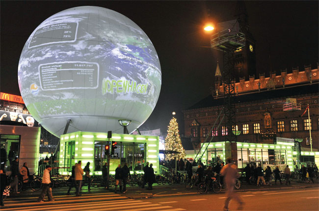 12 月7 日,記者抵達(dá)哥本哈根。據(jù)說,有大約1200 輛豪華汽車、140 架私人飛機(jī)以及數(shù)萬人涌入哥本哈根,為此,丹麥政府不得不為會議購買價值60 萬歐元的“碳積分”。中國和美國成為會場里最受關(guān)注的焦點。而在會場外,到處可見環(huán)保人士的環(huán)保秀,來自小島國代表的示威抗議也此起彼伏。此時,受人矚目的哥本哈根變成了一個環(huán)!按笮銏觥。