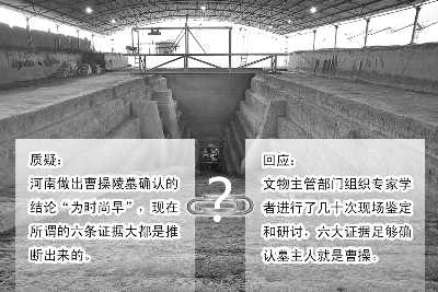 對(duì)于學(xué)者質(zhì)疑,河南省文物局副局長(zhǎng)、新聞發(fā)言人孫英民進(jìn)行了回應(yīng)。他表示,曹操陵墓本身爭(zhēng)議很大,河南省文物局對(duì)于曹操陵墓的確認(rèn)和發(fā)布非常慎重——從2009年10月開始發(fā)現(xiàn)有證據(jù)表明可能為曹操陵墓后,國家文物主管部門先后組織了歷史學(xué)、考古學(xué)、古文字學(xué)、人骨鑒定方面專家學(xué)者,進(jìn)行了幾十次現(xiàn)場(chǎng)鑒定和研究討論,最后得出的結(jié)論是,目前掌握的六大證據(jù),足夠確認(rèn)墓主人就是曹操。河南省文物局根據(jù)專家意見,報(bào)經(jīng)國家文物局同意之后,對(duì)外統(tǒng)一發(fā)布了曹操陵墓確認(rèn)的消息,整個(gè)過程是嚴(yán)謹(jǐn)和慎重的。