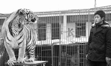 成熟的老虎僅有兩三歲兒童的智力,馴虎不能急于求成。胡敬才說,再好的馴虎人也需要數(shù)月的情感磨合,否則不可能和老虎建立“朋友關(guān)系”。為贏得老虎的“芳心”,馴虎人每天要和老虎在一起待六七個小時,每周要給老虎改善生活,豬肉、羊肉、牛肉等一應(yīng)俱全,夏天每天中午還要給老虎“裸浴”一次,并經(jīng)常為老虎梳理毛發(fā);冬天要給老虎的籠子加蓋防凍布。