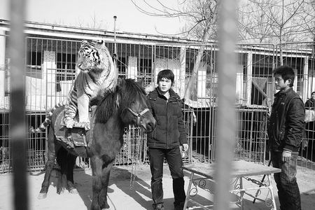 梅正川說,梅莊人馴虎已有近百年歷史。清朝末,有梅莊人開始以街頭現(xiàn)場馴獸表演為生,時間久了仿效者增多,平庸的表演已難以維持生計,一些人開始引入東北虎表演,贏得了市場,并摸索出一套獨(dú)特的馴虎方法。