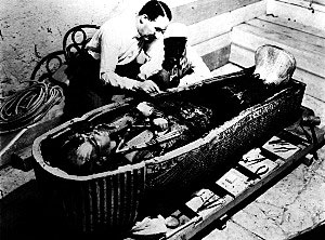 圖坦卡蒙陵墓的發(fā)掘被認(rèn)為是考古學(xué)史上最榮耀的時刻之一。墓穴的四個房間里發(fā)現(xiàn)了超過五千件以上的陪葬品,包括家具、香水瓶、蒼蠅拍和鴕鳥毛等。最重要的是,卡特發(fā)現(xiàn)了一具重約134.3公斤黃金打造的棺槨,找到了戴黃金面具的圖坦卡蒙王木乃伊。