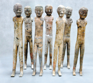 “這些陶俑與漢陽陵的陶俑相似,大約60厘米高。”張仲立說,現(xiàn)在雖然看著陶俑都是赤身裸體,沒有胳膊,但在胳膊處都留有孔,而在坑內(nèi)專家們還發(fā)現(xiàn)了盔甲的殘片,可見這些陶俑原先都穿有各種各樣的衣服。而在坑內(nèi),出土了大量的兵器銅鏃、刀、箭等,還有十分少見的6金6銅的青銅鐘,還有做飯用的陶釜。