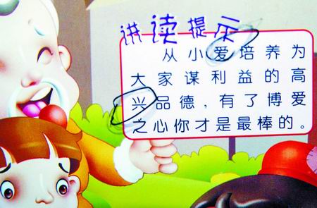趙先生告訴記者,他買的是“寶寶第一本精典童話”叢書中的一本《神筆馬良》。仔細翻看,錯誤百出。在“從小愛培養(yǎng)為大家謀利益的高興品德”(如圖)這一句話中,居然出現(xiàn)兩處錯誤:其中“從小愛培養(yǎng)”中的“愛”應為“就”;“高興品德”中的“興”,應為“尚”。該書中為“哪吒”的“哪”注音竟是“na”……
