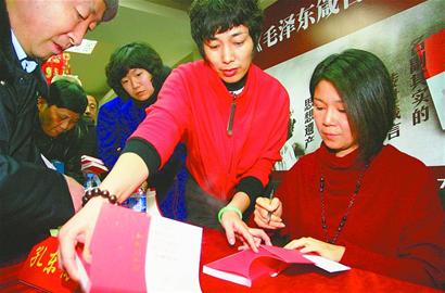 7日下午,天氣有點(diǎn)陰冷,但泉城路新華書(shū)店門(mén)前卻是一片火熱氣氛,一條長(zhǎng)隊(duì)從書(shū)店大廳一直排到書(shū)店外面。這么多人早早聚在這里,是為了等待毛澤東的外孫女孔東梅來(lái)此簽售《毛澤東箴言》。