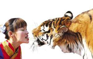 晁改敏被蘇州人熟悉,是在去年11月。那時,她所在的馬戲團與蘇州白象灣景區(qū)正式簽約,她和丈夫也告別了各地流動演出的生活,帶著英雄虎爸虎媽和它們的兩只虎寶寶,在蘇州暫時定居。白象灣景區(qū)開園的時候,晁改敏表演了叼肉喂虎節(jié)目,此前她曾因此節(jié)目,被譽為中國第一馴虎女郎。當她叼著肉,老虎從她的嘴邊把肉吞下時,她的口與虎口近乎零距離。此后,游人多的時候,晁改敏總會表演這一節(jié)目,晁改敏也因此在蘇州名氣響亮。
