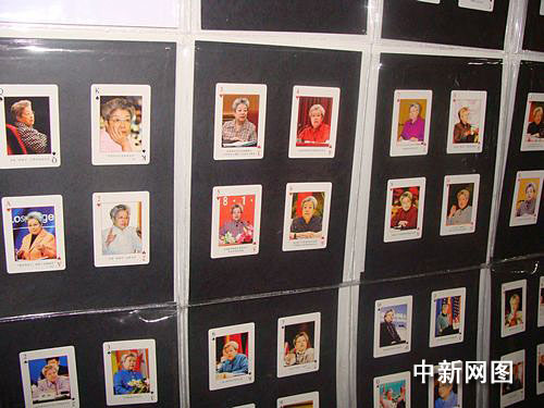 徐州撲克大王姚煥新從收藏的撲克牌中,精心挑選50余副關(guān)于女性題材的特色撲克牌并制作成40余塊展板。在巡展現(xiàn)場(chǎng),記者看到,展板里有以古代女性為主題的《歷代百美圖典》、《中國歷代才女》,也有現(xiàn)代流行的青春偶像《S.H.E》、《臺(tái)灣第一美女林志玲寫真》;有中國的《巾幗英!贰ⅰ端问先忝谩,也有外國的《鐵娘子》、《折翅的鐵蝴蝶》;有《二戰(zhàn)魅力女郎》,也有現(xiàn)代《中國女兵》。