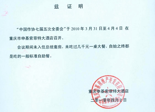 中國作協(xié)的聲明稱,于2010年3月30日至4月2日在重慶申基索菲特大酒店先后召開了七屆九次主席團(tuán)會和七屆五次全委會。其間,各大媒體對會議內(nèi)容作了大量報道,對與會作家作了大量采訪,向社會傳達(dá)了中國文學(xué)繁榮發(fā)展的信息。