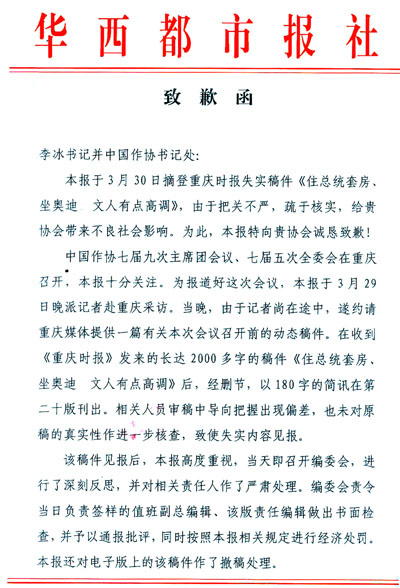 報(bào)道此事的《華西都市報(bào)》也向中國(guó)作協(xié)發(fā)出了致歉函。致歉函稱:本報(bào)于3月30日摘登重慶某媒體失實(shí)稿件,把關(guān)不嚴(yán),疏于核實(shí),給貴協(xié)會(huì)帶來(lái)不良社會(huì)影響。為此,本報(bào)特向貴協(xié)會(huì)誠(chéng)懇致歉。