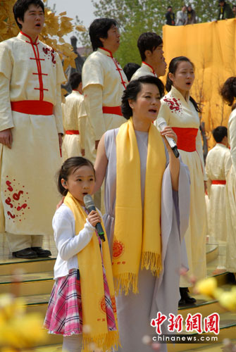 中新網(wǎng)鄭州4月16日電(記者 王中舉)4月16日上午9時(shí)50分,庚寅年黃帝故里拜祖大典將在河南新鄭黃帝故里舉行。北京奧運(yùn)會(huì)開幕式演唱《歌唱祖國(guó)》的中國(guó)童星林妙可與中國(guó)著名歌唱家毛阿敏領(lǐng)唱《黃帝頌》,一大一小、和聲共唱,溫馨動(dòng)人的頌歌感動(dòng)了在場(chǎng)的每一位中華兒女。