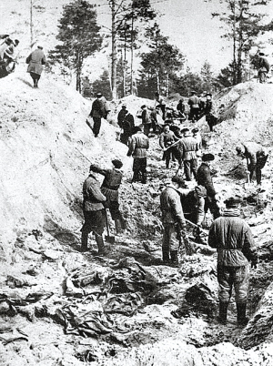 1943年4月13日,柏林電臺(tái)向全世界報(bào)告的一則消息,說在蘇聯(lián)斯摩棱斯克附近的卡廷森林發(fā)現(xiàn)了一批埋有成千上萬波蘭軍官尸體的巨大墳?zāi)梗麄兌际潜蝗擞胁襟E并且熟練地處決的。