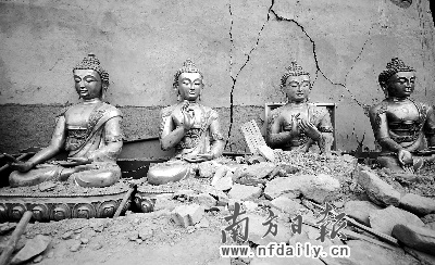 郭紅:目前我們只能從表面現(xiàn)象看這些文物的受損程度,還在做初步的鑒定。另外,這些受損的文物,像一些塔,都是受《文物法》保護的,我們不能隨意改動。而且一個寺院有很多建筑,有可能主經(jīng)堂受到損壞,其他地方?jīng)]有損毀,這些都要具體問題具體分析。因此這些文物今后是要重建、移址重建或者修復(fù),我們要等國家的鑒定組過來,作出詳細判斷之后才能決定。
