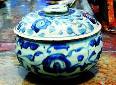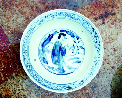 目前見到的文物種類主要是青花瓷大盤,此外也有青花瓷缽、青花小酒杯、青花碗、貼塑龍紋罐、銅板、鐵器及金屬凝結(jié)物等等。崔勇介紹,其中青花瓷大盤和帶蓋青花瓷缽是有代表性的器物,瓷胎和釉質(zhì)比較厚重,青花顏色不太鮮亮,發(fā)灰或者發(fā)黑,無論人物還是花草圖案都比較隨意,器表施滿釉,底足粘有細(xì)砂,即“砂足器”,屬于外銷瓷中的常見類型。
