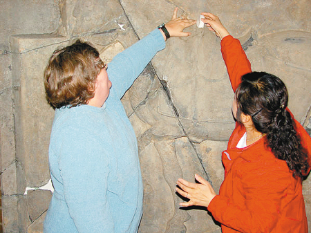 賓夕法尼亞大學(xué)博物館首席文物保護(hù)專家琳·格蘭特女士這兩天很興奮,一是中國文物修復(fù)專家的到來,帶來了東方文物修復(fù)理念,二是中國專家?guī)淼摹罢蚜炅E”殘塊石膏模型,竟與二駿中拳毛騧馬鞍斷裂部分非常匹配。格蘭特女士激動地對記者說:這真是難以置信的成果,“二駿”來到美國快一百年了,它身上掉的另一塊石頭又找到,太讓人高興了。