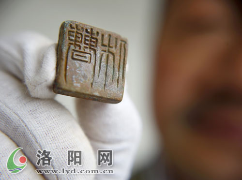 后室西南角的地面上,一方銹跡斑斑的印章赫然“躺”在地上!拔覀儺(dāng)時激動得要命,考古中能得到文字性的東西,簡直就是驚天發(fā)現(xiàn)!”李光夫笑著說,當(dāng)時,大家小心翼翼地將印章用密封袋保存,然后給領(lǐng)導(dǎo)打電話“報喜”。