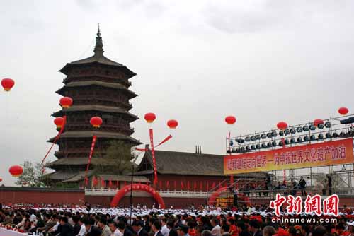 中新網(wǎng)朔州5月21日電 (翟玉成 張恩)21日上午,近萬名山西應(yīng)縣民眾匯聚在釋迦塔下,為木塔申報(bào)世界文化遺產(chǎn)加油。