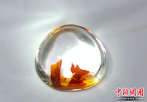 全國30多個單位的參展商帶來的珍品將整個展館擺放的滿滿當當。當記者來到水晶展柜前時,來自西安的張老板拿出了自己收藏了十多年的天然水晶“王者之鳳”。據他介紹,天然水晶是水受到擠壓后形成冰膜,吸取地下的氧化亞鐵和鎂元素后形成的!巴跽咧P”原產地為巴西,圖為一只頭戴王冠的鳳凰昂首挺胸站在山頂上,鳳尾向下飄垂,紅黃兩色代表著吉祥喜慶,極其罕見。