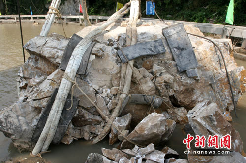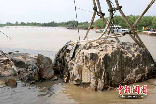 中新網(wǎng)鎮(zhèn)江6月4日電(趙國財(cái) 唐娟)4日下午,首塊《瘞鶴銘》摩崖石刻疑似殘石被巨型“勇士號”浮吊船吊起約半米后發(fā)生碎裂,首次起吊被迫終止。在打撈人員下水清理碎石后,傳來最新消息!动廁Q銘》打撈項(xiàng)目現(xiàn)場總指揮王雷介紹,碎裂的石頭不會(huì)對其他三塊預(yù)備打撈的石頭造成損壞。相較于首塊殘石,他更寄希望于壓在該石下面的殘石。他表示,爭取一周后展開第二次打撈。