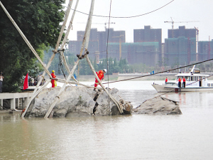 鎮(zhèn)江文廣新局副局長孫小梅表示,在打撈預(yù)案中已有巨石破裂的預(yù)案,并且打撈方認(rèn)為這種可能性超過50%,因?yàn)榫奘菑慕股巾斏纤ぢ渲两械氖w早已受損;加上多年的風(fēng)化、江水長期浸泡,使得石體出現(xiàn)質(zhì)變。打撈只不過將巨石的隱性傷痕變?yōu)轱@性。