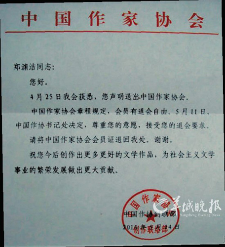 中國作協(xié)發(fā)給鄭淵潔的信中寫道:“5月11日,中國作協(xié)書記處決定,尊重您的意愿,接受您的退會要求。請將中國作家協(xié)會會員證退回我處。謝謝。祝您創(chuàng)作出更多更好的文學作品,為社會主義文學事業(yè)的繁榮發(fā)展做出更大貢獻”。信的簽章是“中國作家協(xié)會創(chuàng)聯(lián)部”,落款日期為6月4日。