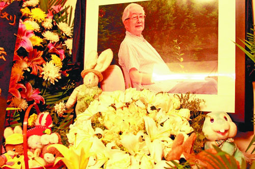 擺放在靈堂上的相片是華老的小兒子華方方在2005年春末拍攝的,就在自家樓下小花壇,一小枝綠色枝條,老人安詳?shù)男δ,氣韻生?dòng),華老生前看過非常滿意。華老屬兔,他和兔子感情特別深,晚年更成了老小孩,睡床四周是大大小小的卡通兔、絨毛兔,他當(dāng)兔子王。現(xiàn)在這些兔子朋友環(huán)繞著他的遺像,華老一點(diǎn)都不寂寞,有兩只他最心愛的玩具兔還將陪他在墓地到老。