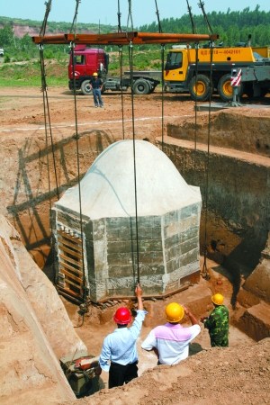 為了確保該墓成功整體搬遷,考古人員用石膏等材料在墓穴外圍做了一層防護(hù),在墓穴東北角處搭置有一個(gè)平臺(tái),平臺(tái)上放置了4根鐵軌作為底座,墓穴整體吊出地面后被放置其上。深坑中的墓室下方被整體架起,墓室成為一個(gè)可以移動(dòng)的整體,然后由吊車進(jìn)行搬遷。