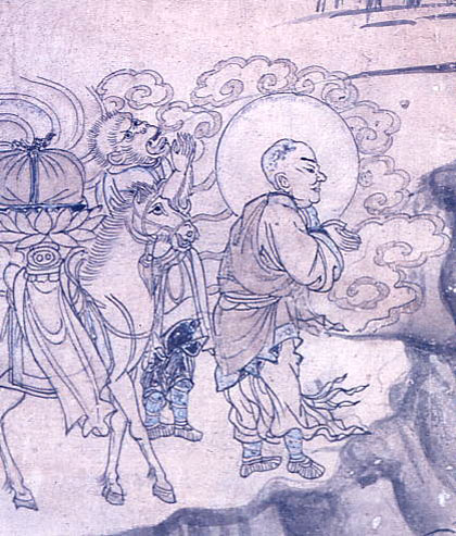 根據壁畫中所描繪的內容,在此之前,一些專家已經將這些圖像確定為唐玄奘取經圖,雙手合十的出家人是玄奘,猴相弟子是孫悟空,馬是玄奘的隨行坐騎。