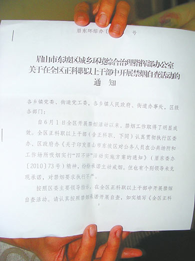 昨日上午,(四川)眉山市東坡區(qū)禁煙行動辦公室(簡稱“治理辦”)工作人員正在起草一份關于禁煙的文件。文件的題目是《眉山市東坡區(qū)城鄉(xiāng)環(huán)境綜合治理指揮部辦公室關于在全區(qū)正科職以上干部中開展禁煙自查活動的通知》,包括幾百字的文字和一份禁煙自查表。