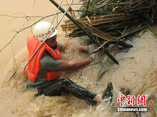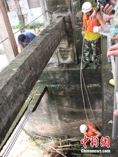 大壩閘門下,水深近6米,水流異常湍急,洪水也異常冰冷,且堆滿了垃圾,雖然消防官兵做好了安全保護,并關(guān)好閘門,下游也安排了漁船隨時準(zhǔn)備救人,但是水下的情況不明,一不小心就有被洪水沖走或被水下雜物扎傷的危險。在其中靠近岸邊的一個孔閘門,大樹與竹子卡在閘門的中間,閘門無法放下,消防官兵只能在異常湍急的水流中作業(yè),由于缺少著力點,水下的消防官兵多次沒入水中,險象環(huán)生,經(jīng)過近20多分鐘的作業(yè)才將雜物捆住。