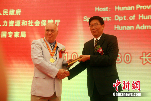 中新網長沙9月30日電(劉柱 華城)30日,湖南省第五屆“瀟湘友誼獎”頒獎儀式暨外國專家國慶招待會在長沙舉行,來自世界13個國家的20位專家榮獲“瀟湘友誼獎”。湖南省省長徐守盛致辭并親自為獲獎專家頒獎。