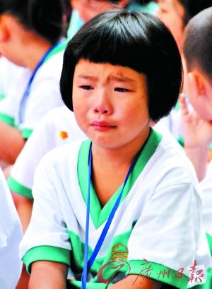 開學(xué)典禮剛進(jìn)行20分鐘,一年(1)班一個(gè)已經(jīng)哭得鼻子紅紅的小姑娘從自己的位置上站起來,走到老師面前,斷斷續(xù)續(xù)地說著什么。老師拍著她的肩膀說了幾句,小姑娘不情愿地坐回原位,豈料越哭越委屈,完全顧不上看臺(tái)上的表演。