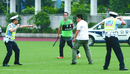 15時(shí)07分,一輛警車開進(jìn)操場,8名全副武裝的飛龍突擊隊(duì)員跳下車門,迅速包圍操場中央圓弧。他們身穿多功能戰(zhàn)術(shù)背心,頭戴防彈頭盔,手握沖鋒槍,大腿外側(cè)還佩戴著手槍。“放下兇器”,一名突擊隊(duì)員通過擴(kuò)音設(shè)備兩次喊話,但兩名持刀男子拒不就擒。