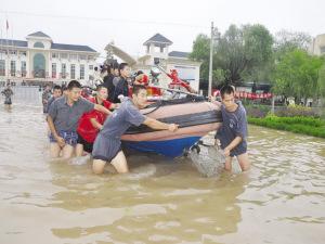 沖鋒舟把孩子們安全送出校門(mén)。高 峰 攝