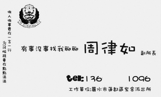 “有事沒事找我聊聊!睂W(xué)生周律如設(shè)計(jì)的名片上用活潑的美術(shù)大字寫了這么一句話,落款是自封的“周律如 副所長”。“呵呵,副所長當(dāng)然只是假想,不過我覺得要多和群眾接觸,才能做好服務(wù)嘛,所以我就這么設(shè)計(jì)啦!”小周說。