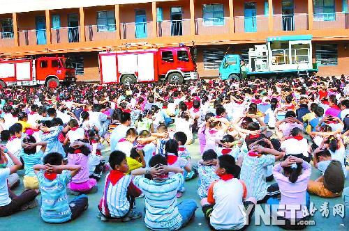 “發(fā)生地震了,如果來不及跑出教室,就立即躲到桌子下面或抱頭蹲到承重墻下,等短暫的地震過后,再迅速撤離教室。如果在衛(wèi)生間內(nèi)要找墻角抱頭蹲下。”小學(xué)生們在消防官兵指導(dǎo)下,都作出同樣動作,在操場演練地震時逃生技能。“以前不知道地震是什么樣的威力,四川地震以后我們學(xué)校老師也講了關(guān)于地震的好幾次課!彼哪昙壍啮┱f,她學(xué)會了“抱頭在桌子或者承重墻下面蹲下”的避震知識,回家要告訴爸爸媽媽。