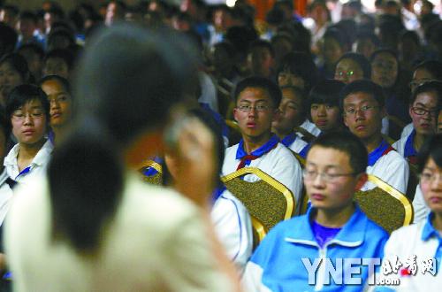 “天佑中華”主題教育活動(dòng)從下午4點(diǎn)30分開(kāi)始,在簡(jiǎn)單的問(wèn)候后北京十一學(xué)校教導(dǎo)處陳雪芬副主任向北川中學(xué)校長(zhǎng)劉亞春詢問(wèn),“是什么力量讓北川中學(xué)克服如此重重困難?”劉亞春校長(zhǎng)難掩悲痛地說(shuō):“其實(shí)作為教師,苦難中首先救助學(xué)生是教師本能的表現(xiàn)。對(duì)于那些罹難的師生來(lái)說(shuō),他們的生命不是消逝了而是永恒了,幸存者也變得更加堅(jiān)強(qiáng)。在今后的日子里,各方的關(guān)心和關(guān)注以及北川中學(xué)師生堅(jiān)強(qiáng)不屈的意志,都是我們戰(zhàn)勝艱難的最基本動(dòng)力!痹捯魟偮洌本┦粚W(xué)校近千名學(xué)生報(bào)以熱烈的掌聲。
