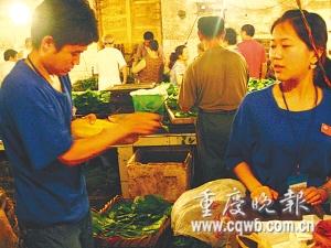 昨日早上七時(shí)至下午五時(shí),來自重慶工商大學(xué)融智學(xué)院管理系大一的八名學(xué)生,和兩位在沙區(qū)土灣模范村農(nóng)貿(mào)市場(chǎng)賣菜的小販互換角色10小時(shí),體驗(yàn)彼此生活。