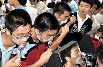 “不是這樣刮的,先要抹剃須泡!”盡管動(dòng)作生疏,500名復(fù)旦大一男生還是一起舉起了剃須刀,剃去了殘留在他們臉上的稚嫩,完成了屬于90后的集體成人禮。昨天,復(fù)旦新生節(jié)上,一場(chǎng)別樣的成人禮在相輝堂舉行。
