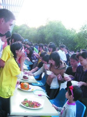 現(xiàn)場烹飪比賽結(jié)束后,各參賽隊伍把自己的成品展示在一排長長的桌子上。現(xiàn)場學生排起了數(shù)十米長的隊伍,人手一只碗,一雙筷,擺好陣勢沖著美食長龍開始了“掃蕩”!捌呃镲h香”雞翅,“盛世金蘭”南瓜煲......各位學生大廚一邊介紹一邊拉票,場面熱鬧非凡。 (記者 薛冰 實習生 林珍 通訊員 何淑賢)