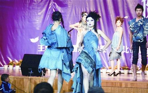 該隊(duì)領(lǐng)隊(duì)夏冬桔介紹,10套參賽服裝是他們用70多件廢舊牛仔服,在設(shè)計(jì)師的指導(dǎo)下花5天時(shí)間撕碎重新拼接,一針一線縫制而成的。廢舊牛仔服由全校同學(xué)捐出,是他們破舊了不再穿了的衣服。