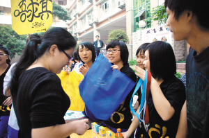 據(jù)了解,今年“搞搞新意思”的地方在于,老師也成為檔主,教導(dǎo)處5個老師注資一千多元開一個“雙飛翼”檔,所賣雞翅都是一位客家籍貫的老師以30幾元一包的價格從家鄉(xiāng)處買來的,而海報也是美術(shù)老師畫的。譚娟娟老師表示,所賺到的錢將捐給關(guān)工委幫扶小組和校內(nèi)有困難的同學(xué),“加入了慈善的因素,有不少學(xué)生并不是真的喜歡吃,是為了幫助人才來‘幫襯’,這體現(xiàn)了他們的愛心,而且老師跟學(xué)生一起參與,體現(xiàn)平等。