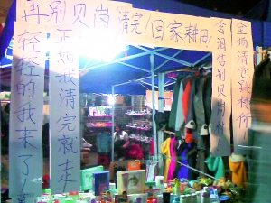 只見(jiàn)高高掛著的白色橫幅“再別貝崗,清完回家耕田”幾個(gè)字格外醒目,再加上“輕輕的我來(lái)了,正如我清完就走”、“含淚告別貝崗村,全場(chǎng)清倉(cāng)跳樓價(jià)”兩幅對(duì)聯(lián)。而“靈堂”下的“祭品”卻是各種名牌護(hù)膚品。對(duì)此,不少人學(xué)生表示很迷惑:“怎么是白色對(duì)聯(lián)呀,應(yīng)該用紅色才對(duì)吧?”隔壁攤位的老板極盡挖苦地說(shuō):“好像死了一家人,等著些錢買棺材似的!倍摗办`堂”的“堂主”,竟是來(lái)自華工的高才生,“因?yàn)闆](méi)有機(jī)會(huì)外出去實(shí)習(xí),我們就通過(guò)這樣的方式來(lái)磨練自己。我們的樣子都這么慘了,大家一動(dòng)心就會(huì)買的!眱蓚(gè)男生強(qiáng)調(diào),做市場(chǎng)營(yíng)銷這一行,需要承受很多異樣的目光和心理壓力,這對(duì)他們來(lái)說(shuō)是極大的鍛煉。