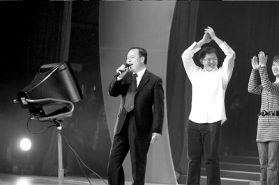 略顯緊張的周校長(zhǎng)“喝口水”的要求得到滿足后,便從衣袋里掏出一張寫有歌詞的白紙,正式開唱。他手握麥克風(fēng),緊盯臺(tái)上的卡拉OK屏幕,高潮處他還會(huì)踮起腳尖“飆高音”。此時(shí),上任校長(zhǎng)許智宏微笑著坐在臺(tái)下,隨聲輕和。